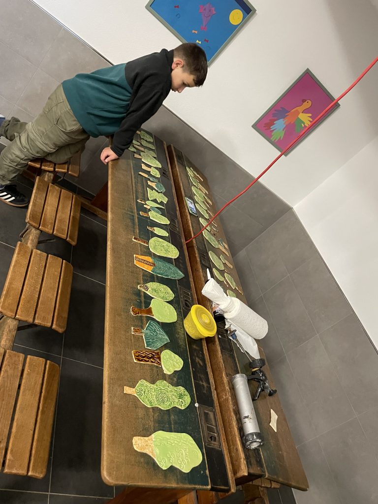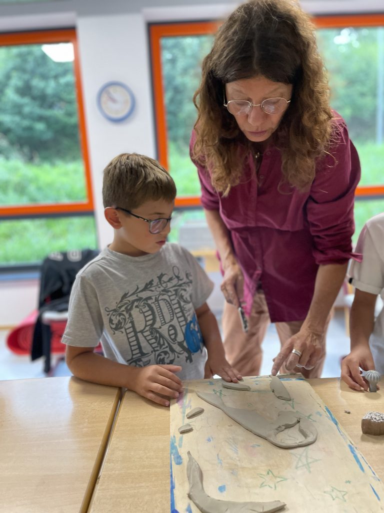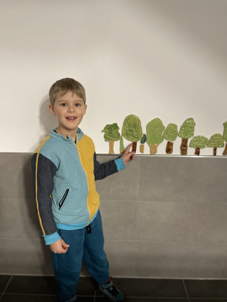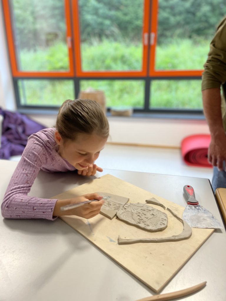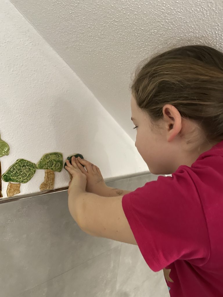 Zu Beginn des Projekts stellten die Kinder eigene Tonfliesen her. Mit viel Freude und Fantasie gestalteten sie unterschiedliche Motive und Strukturen. Ob Muster, Figuren oder freie Formen – jede Fliese ist ein kleines Kunstwerk für sich.